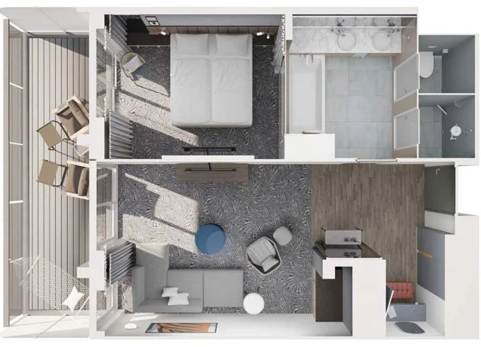 JKBO - Junior Suite s balkónom B 26 m² + balkón 7 m² so stoličkami a podnožkami. 8-12. paluba. Max 4 osoby. Výhody Junior Suite. 3 786 € 1 262 € za osobu
